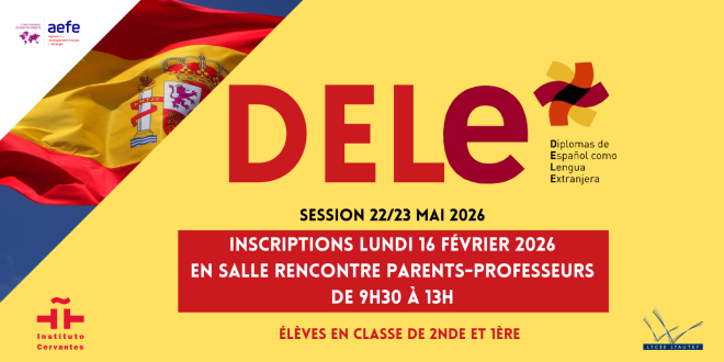 Les inscriptions au DELE sont prévues le lundi 16 février, de 9h30 à 13h00, salle rencontre parents professeurs (à côté la vie scolaire-lycée), auprès de l’administration de l’Institut Cervantes.
