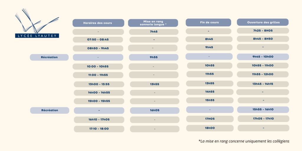 Retrouvez ici l’ensemble des horaires et calendriers pour suivre facilement la vie scolaire au sein du lycée Lyautey.